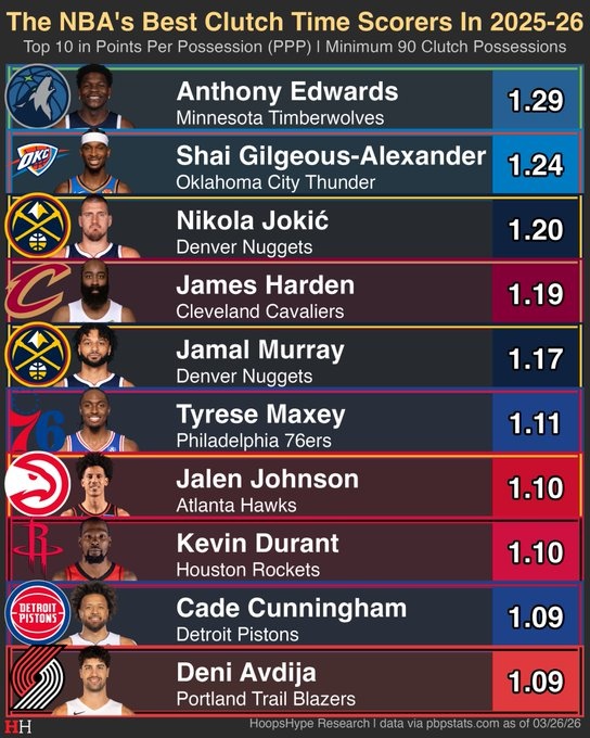 彩票网-本赛季关键时刻每回合得分top10:华子1.29分第1 哈登第4 KD第8